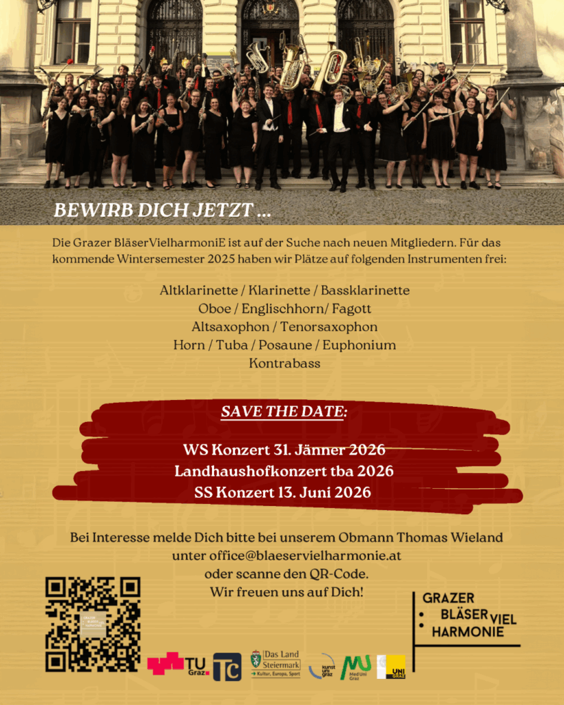 Mehr über uns erfährst du auch auf facebook.com/blaeservielharmonie oder instagram.com/grazer.blaeservielharmonie!